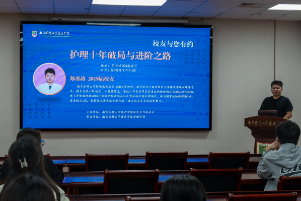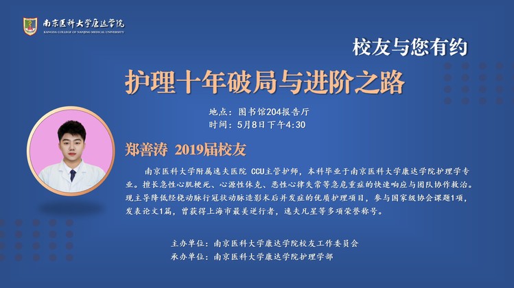 5月8日下午,我院在图书馆204举办“校友与您有约”系列讲座第十八讲,2019届护理学专业校友、南京医科大学附属逸夫医院CCU主管护师郑善涛以“护理十年破局与进阶之路”为题作交流分享。校友工作办公室老师、护理学部师生代表80余人参加了讲座。