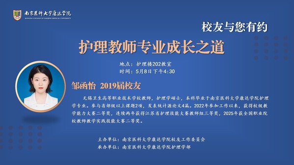 5月8日下午,我院在护理楼202室举办“校友与您有约”系列讲座第十九讲,2019届护理学专业校友、无锡卫生高等职业技术学校教师邹函怡重返母校,与护理学部30余名学生一起分享她从护理学子到教学能手的成长之路。
