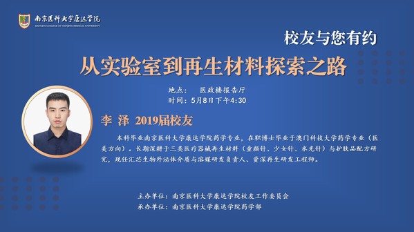 5月7日下午,我院在报告厅举办“校友与您有约”系列讲座第二十讲,2019届校友、澳门科技大学药学专业(医美方向)博士李泽以“从实验室到再生材料探索之路”为题作交流分享,药学部师生代表参加了讲座。